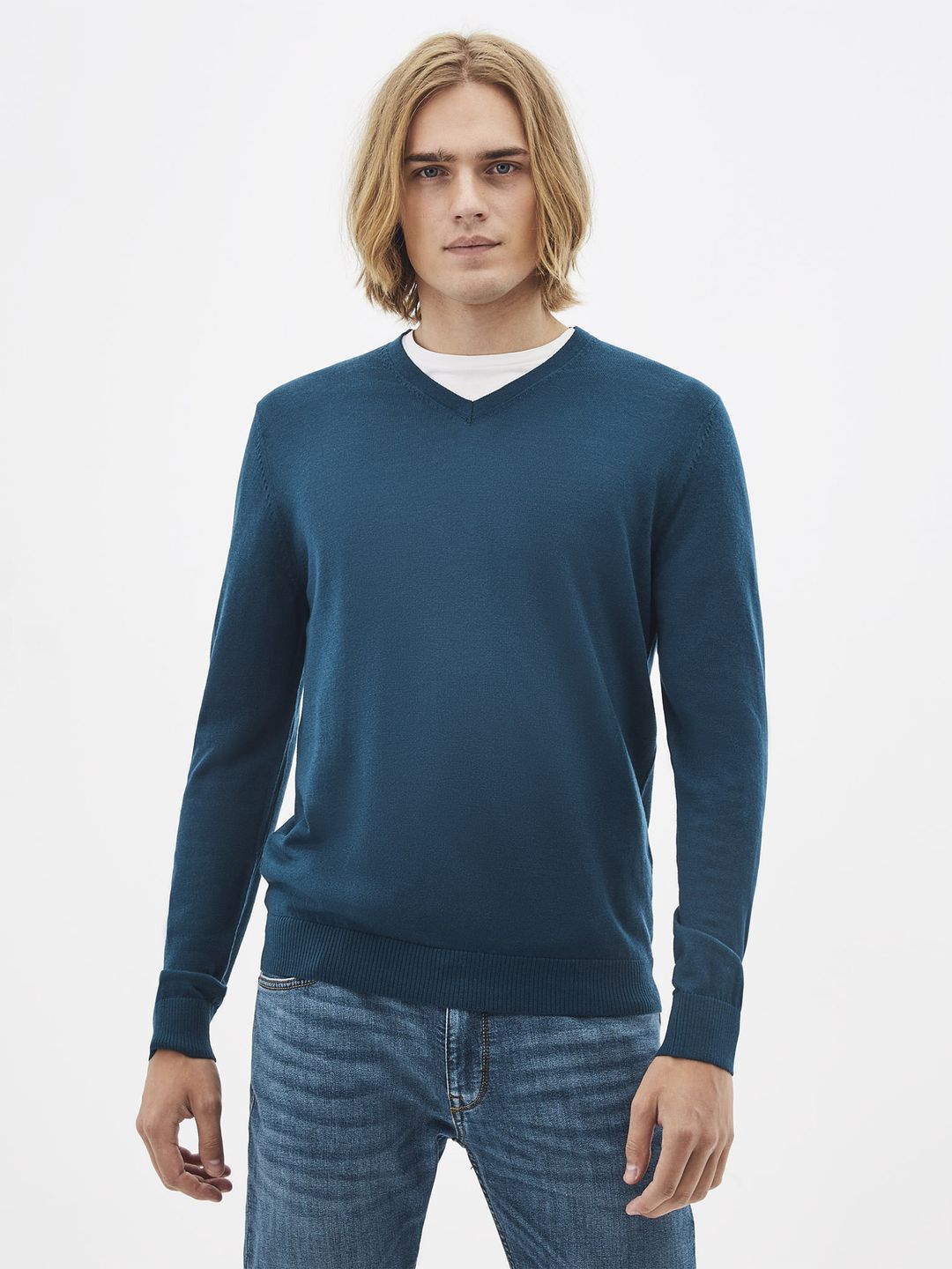 Svetr s hladkou strukturou. Velmi jemná merino vlna. Výstřih do V. Pružné náplety.
