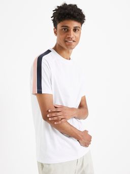 Bavlněné tričko s krátkým rukávem a kulatým výstřihem. Dva barevné široké pruhy na ramenou.