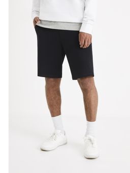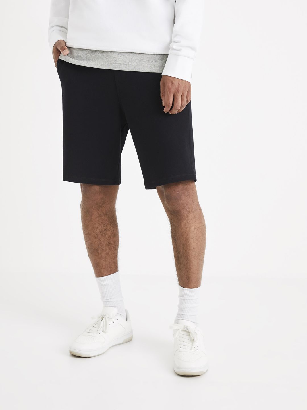 Teplákové kraťasy s pružným pasem. Stahovací šnůrka. Šikmé boční kapsy a jedna zadní kapsa. Volný střih a délka nad kolena.