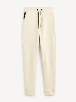 Sportovní jednobarevné tepláky. Pružný pas se stahovací šňůrkou. Šikmé boční kapsy se zapínáním na zip. Dlouhé nohavice s náplety.