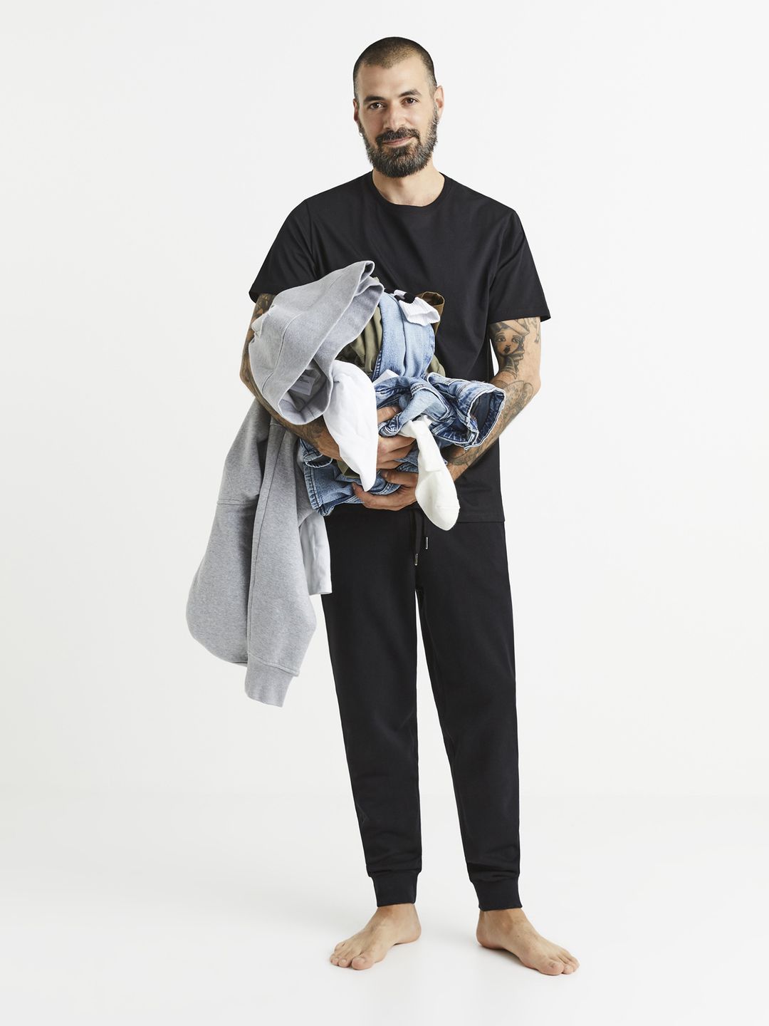 Bavlněné tepláky jogging. Pružný pas se stahovací šňůrkou. Boční šikmé kapsy. Nohavice s pružným nápletem.