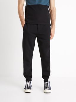Tepláky s pružným pasem a falešným poklopcem. V pase navíc stahovací tkanička. Přední šikmé kapsy a vzadu našitá kapsa. Tepláky jsou ozdobeny na boku podélným pruhem v šedé barvě. Nohavice jsou dlouhé a zakončené do pružného lemu.