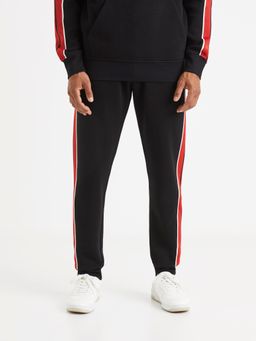Tepláky s pružným pasem. Šikmé přední kapsy a zadní kapsa. V pase stahovací šňůrka. Po stranách nohavic dva podélné červené pruhy. Zúžené nohavice. Pružné náplety.
