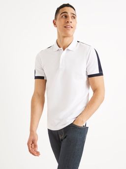 Polo tričko s krátkým rukávem a měkkým límečkem. Na ramenou široký barevný pruh. Rovný střih a příjemný materiál s elastanem.