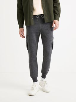 Sportovní melírované jogging tepláky z úpletu. Velké kapsy s klopou. Jedna zadní kapsa. Pružný pas se stahovací šňůrkou. Nohavice s pružnými náplety.