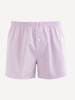 Bavlněné trenýrky s pružným pasem. Poklopec se zapínáním na knoflíček. Vzdušný a volný střih. Drobný kostkovaný vzor.