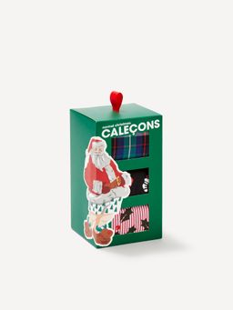 Bavlněné trenýrky ve vánočním dárkovém balení. Celkem 3 kusy. Různé barvy a vzory. Pružný pas, volný a vzdušný střih. Ozdobná papírová krabička.