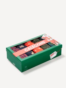 Bavlněné trenýrky ve vánočním dárkovém balení. Celkem 5 kusů. Různé barvy a vzory. Pružný pas, volný a vzdušný střih. Ozdobná papírová krabička.