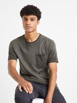 Bavlněné tričko s lehkou batikou. Na hrudi našitá malá kapsička. Krátký rukáv a kulatý výstřih.