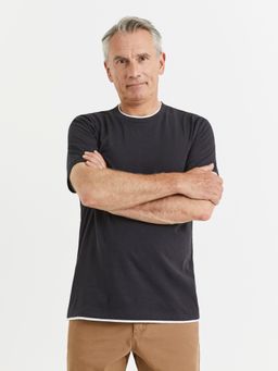Jednobarevné tričko s bílým olemováním. Kulatý výstřih a krátký rukáv. Rovný střih. 100% bavlna.