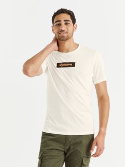 Jednobarevné tričko s nápisem. Krátký rukáv a kulatý výstřih ke krku. 100% bavlna.