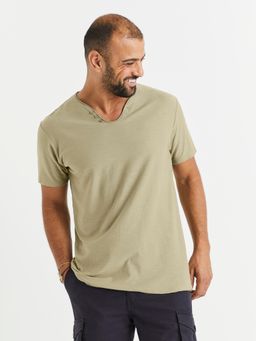 Hladké jednobarevné tričko s krátkým rukávem. Zajímavý částečně kulatý výstřih s vykrojením do V. 100% bavlna.