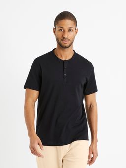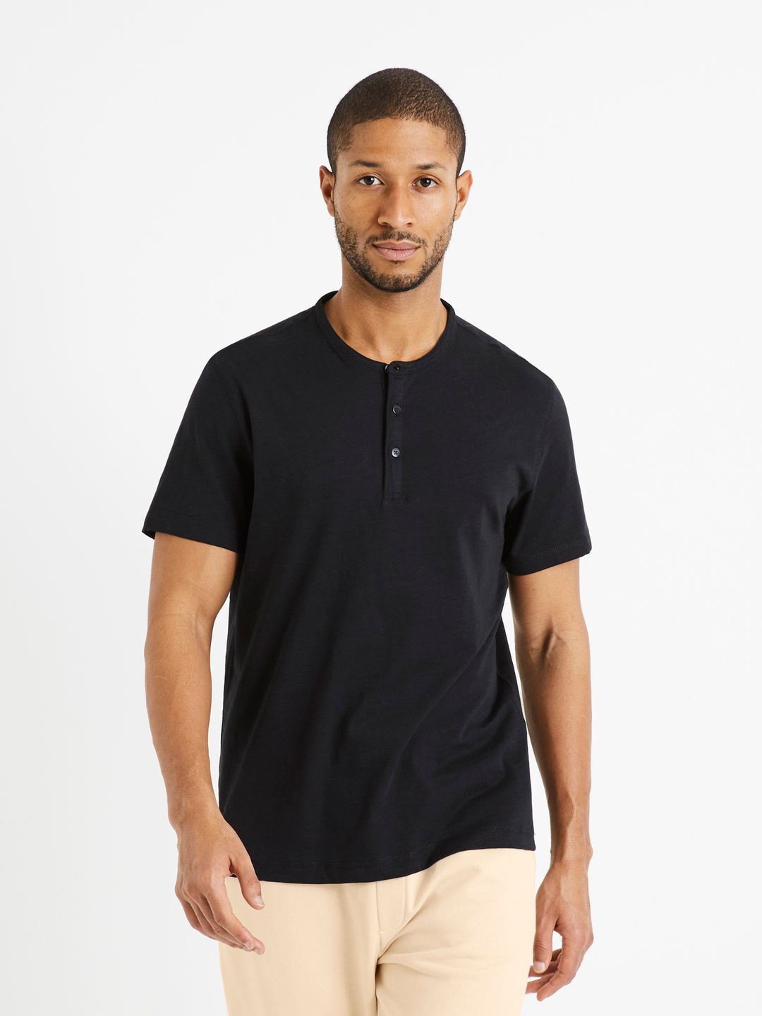 Basic tričko s kulatým výstřihem. Se zapínáním na knoflíčky. Krátký rukáv a rovný střih. Měkký bavlněný úplet.