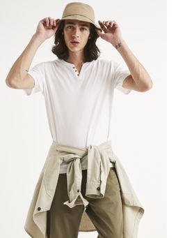 Hladké bavlněné tričko s netradičním výstřihem u krku. Ve výstřihu tři knoflíčky. Krátké rukávy a rovný střih.