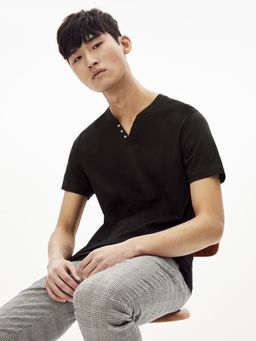 Hladké bavlněné tričko s netradičním výstřihem u krku. Ve výstřihu tři knoflíčky. Krátké rukávy a rovný střih.