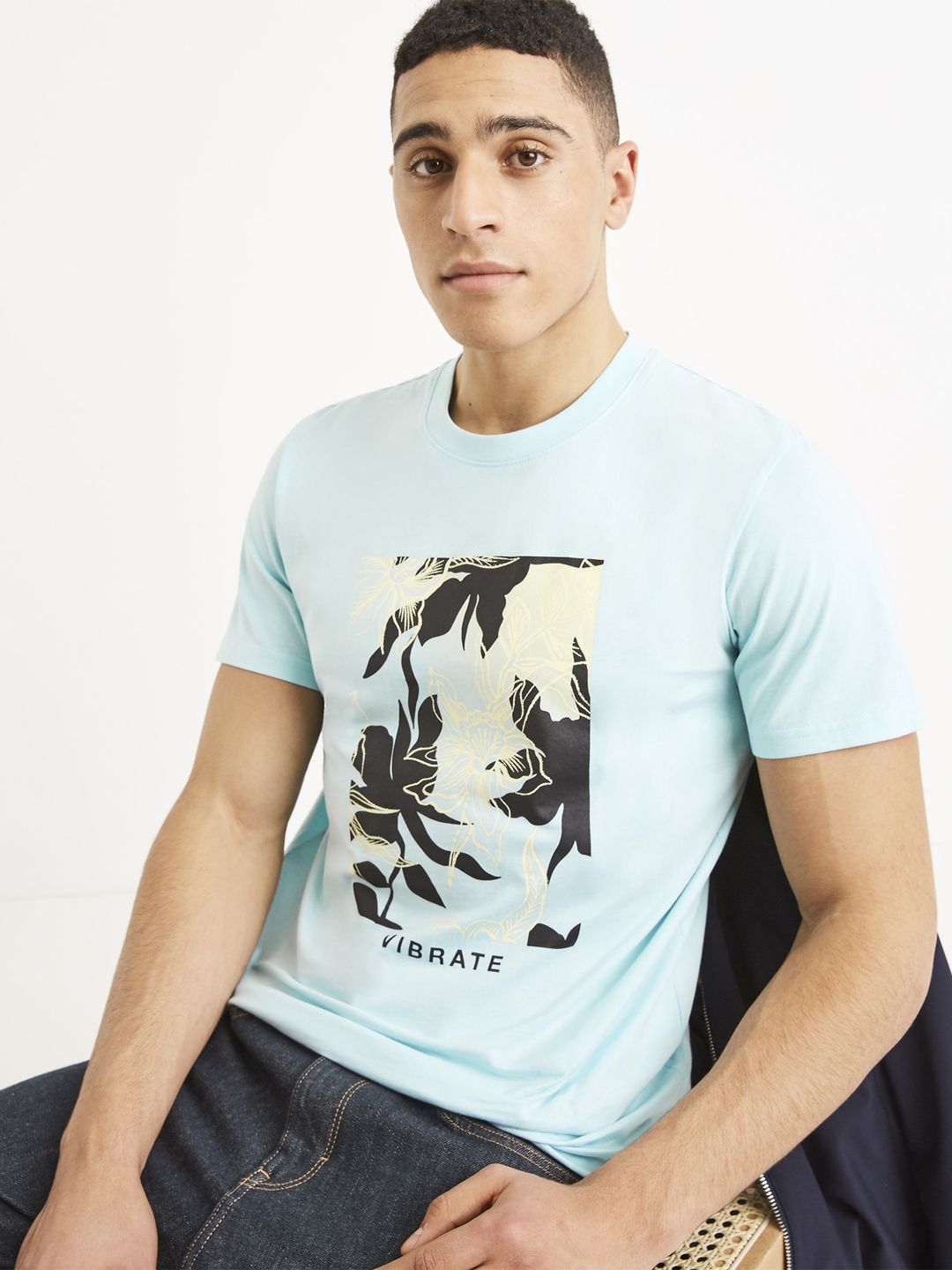 Bavlněné tričko ve světle modré barvě. Stylový černobílý potisk. Krátký rukáv a kulatý výstřih ke krku.