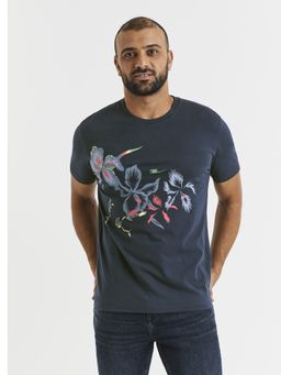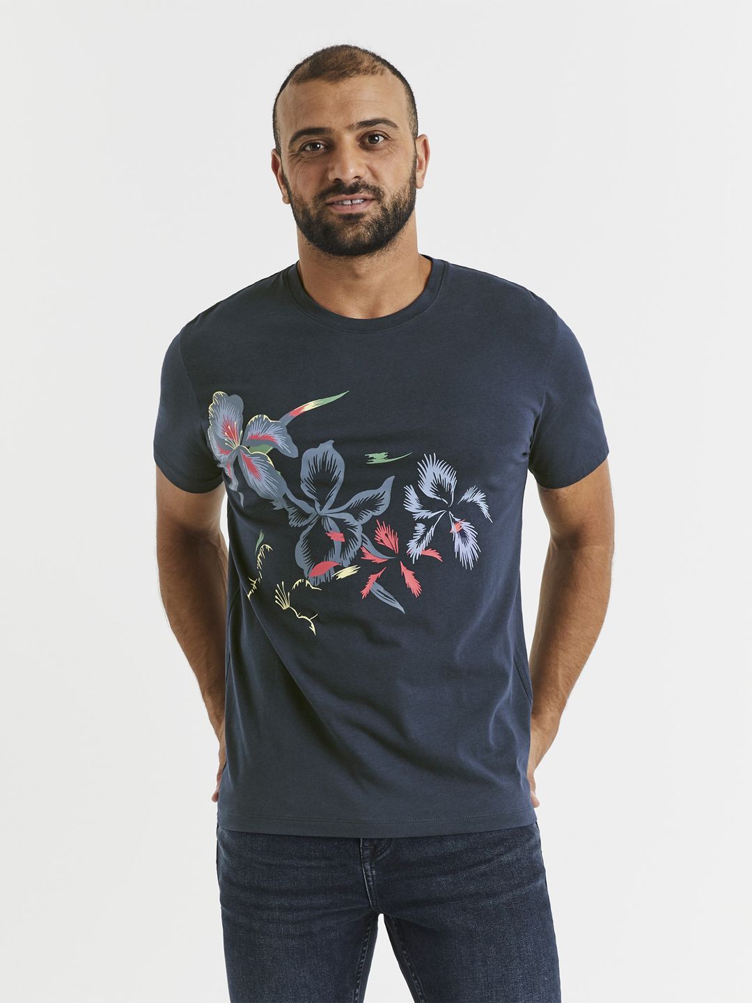 Bavlněné tričko s barevným potiskem. Krátké rukávy a kulatý výstřih ke krku. Rovný střih.