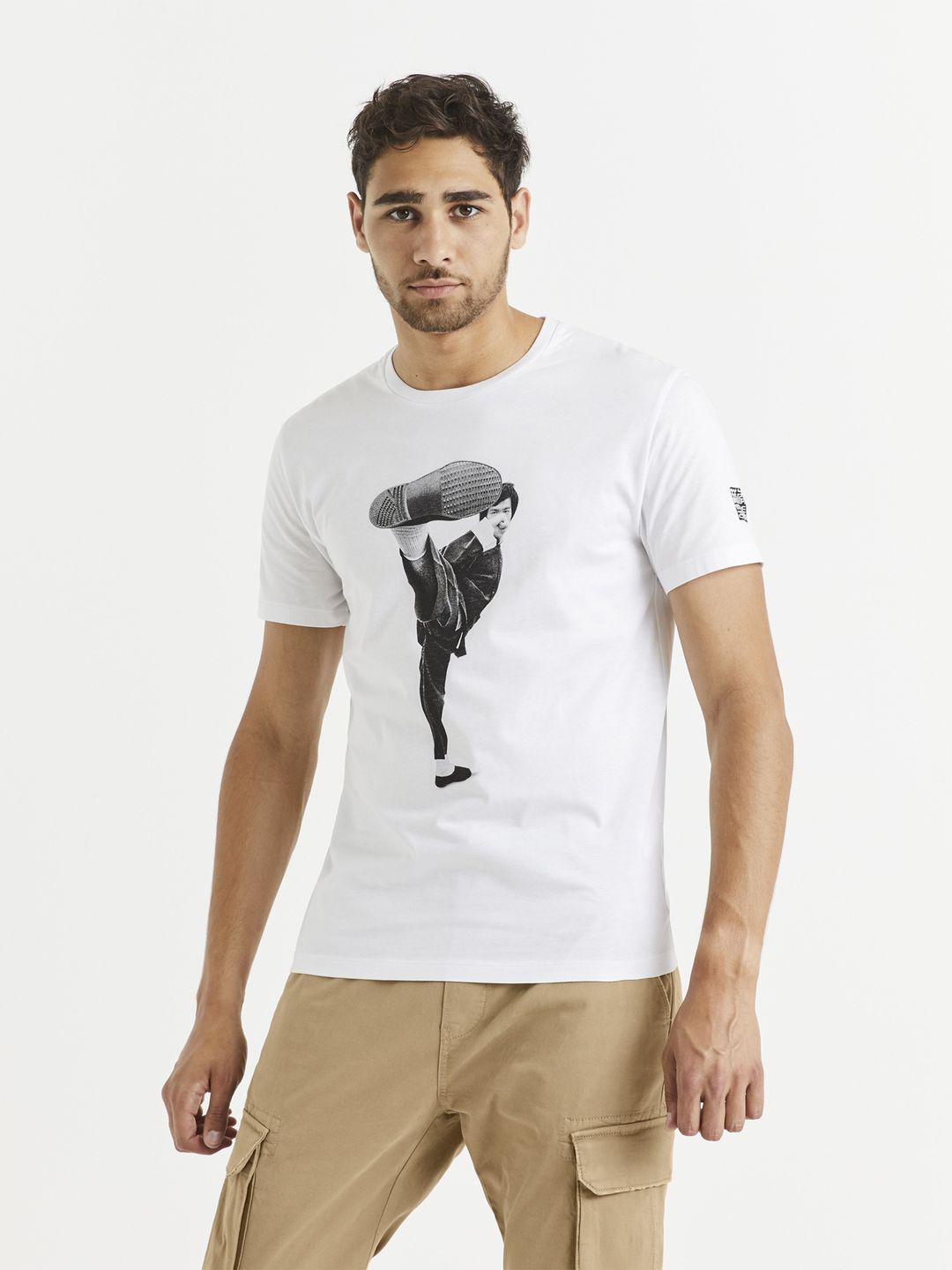 Bílé tričko s potiskem Bruce Lee. Krátké rukávy a kulatý výstřih. 100% bavlna.