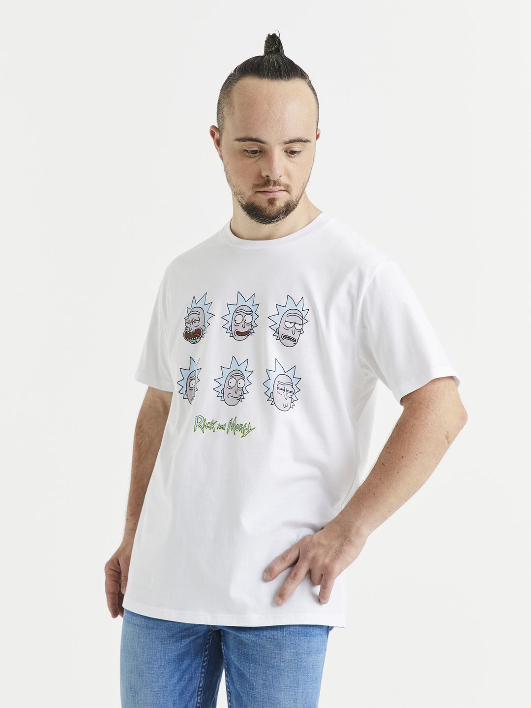 Bavlněné bílé tričko s nápisem Rick and Morty. Krátký rukáv, kulatý výstřih a rovný střih.