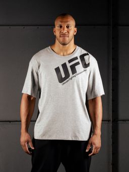 Šedé tričko s krátkým rukávem. S logem UFC v černé barvě a nápisem "Ultimate Fighting Championship" na přední straně.