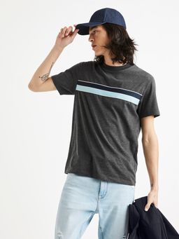 Jednoduché tričko s modrým pruhem na hrudi. Tričko má krátký rukáv a kulatý výstřih a je vyrobeno z příjemné směsi. Tričko bude skvělě vypadat k džínám i kalhotám.