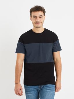 Bavlněné tričko s krátkým rukávem. Široký pruh v tmavě šedé barvě. Na hrudi našitá malá kapsička.