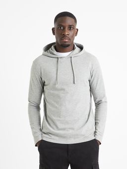 Hladké tričko s kapucí. Dlouhé rukávy. Kapuce se stahovací šňůrkou. Rovný střih. Světle šedý melír. Bavlněné s elastanem.