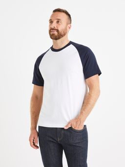 Dvoubarevné bavlněné tričko s raglánovými rukávy. Kulatý výstřih ke krku.
