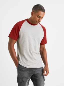 Tričko s krátkým rukávem. Červené raglánové rukávy. Kulatý výstřih ke krku. 100% bavlna.