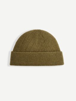 Jednobarevná zimní čepice z měkkého žebrovaného úpletu s ohrnutým lemem.