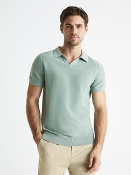 Jednobarevné úpletové tričko. U krku košilový límeček. Krátký rukáv. Tričko má pružné lemy. 100% bavlna.