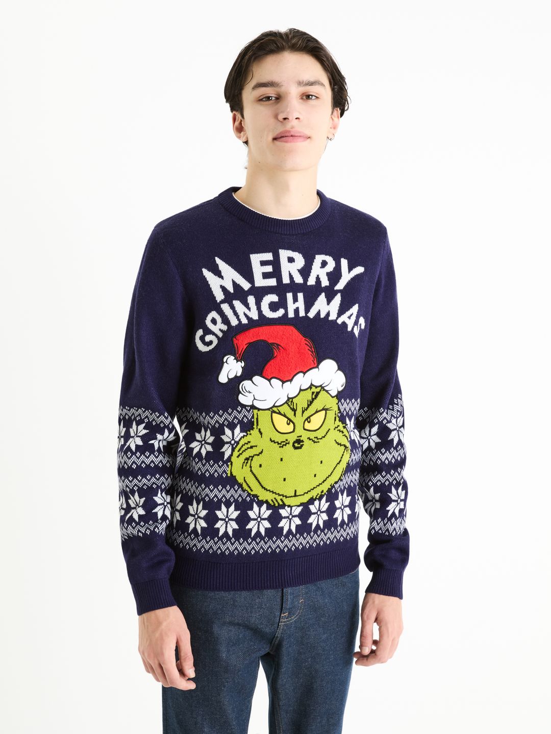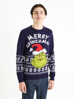 Vánoční svetr Grinch v modré barvě. S nápisem Merry Grinchmas. Výrazný žakárový vzor v kontrastní barvě. Dlouhé rukávy a kulatý výstřih. Pružné žebrované lemy.