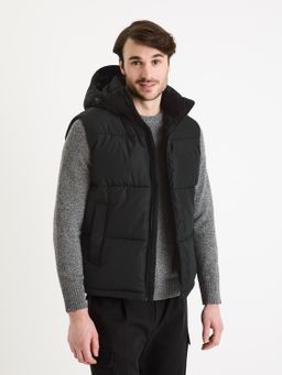 Prošívaná vesta s kapucí. Zateplená a s podšívkou. Zapíná se na zip. Přední šikmé kapsy. S voděodolnou úpravou. Na vnitřní straně kapsička. Rovný střih.