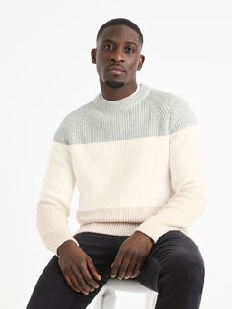 Vlněný svetr s pruhy. Dlouhé rukávy a kulatý výstřih.