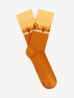 Vysoké ponožky s výrazným vzorem. Zesílená špička i pata. Pružný žebrovaný lem.