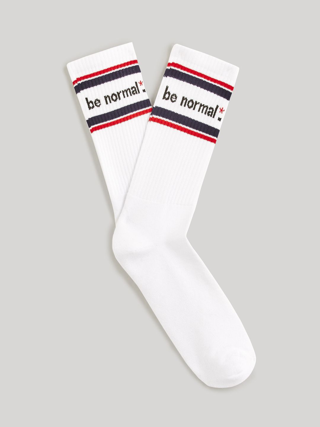 Bílé vysoké ponožky s nápisem „Be normal“. Příjemný materiál.