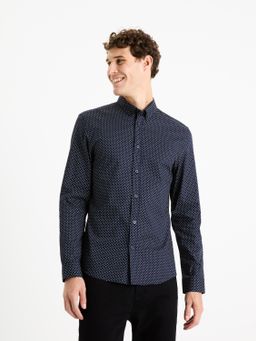 Bavlněná košile s dlouhým rukávem. Slim střih. Drobný plošný vzor. Košile má menší límeček se zapínáním na knoflíčky a zaoblený spodní lem. Skvěle bude vypadat k elegantním kalhotám.