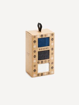 Dárkové balení bavlněných boxerek s elastanem. V balení celkem 3 kusy. Barvy modré, šedé a bílé. V pase všitá široká a pružná guma. Ozdobná krabička s poutkem.