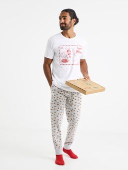 Dárkové netradiční balení bavlněného pyžama v pizza krabici. Pyžamo se skládá ze dvou dílů. Trička s krátkým rukávem a pyžamových kalhot s pružným pasem a náplety.