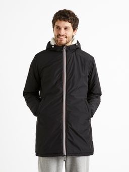 Černá zateplená parka s kapucí se stahovací šňůrkou a zapínáním na zip. Umělý beránek v bílé barvě nejen zahřeje, ale kontrastuje s barvou bundy. Beránek je i v kapuci. Bunda má zadní delší a zaoblený díl. Přední šikmé kapsy a rukávy s pružným lemem. Vrchní vrstva je vodoodpudivá a je zateplena vrstvou z recyklovaného materiálu.