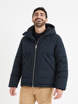 Hřejivá zimní bunda se zapínáním na zip. Kapuce a vysoký límec. Přední šikmé kapsy. Vnitřní kapsička na zip. Jednobarevná.